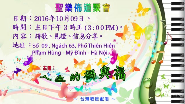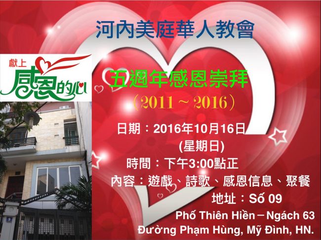 *感恩: 1. 感謝神!十月九日美庭聖樂佈道有七位決志。 2. 感謝神!十月十五日芒街舉行第一次華人崇拜。 3. 感謝神!十月十六日紀念美庭教會成立五週年的 感恩崇拜近四十人出席。 *代禱: 1. 為患病肢體禱告:曾昭成弟兄之母、阮氏錦姊妹之母、 黃瓊李姊妹、陳明英姊妹… 2. 為溫馨茶聚禱告。 3. 為籌備聖誕節佈道禱告。