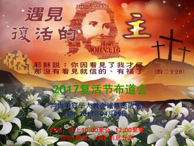 2017年04月感恩&代禱事項 每月感恩與代禱By adminhcc08/04/20171- 感恩: + 感恩神!芒街第一次在固定的聚会所聚会一切都顺利。 2- 代 祷: + 请为4月9日在美庭复活节布道会祷告。 + 请为4月16日在芒街复活节布道祷告。